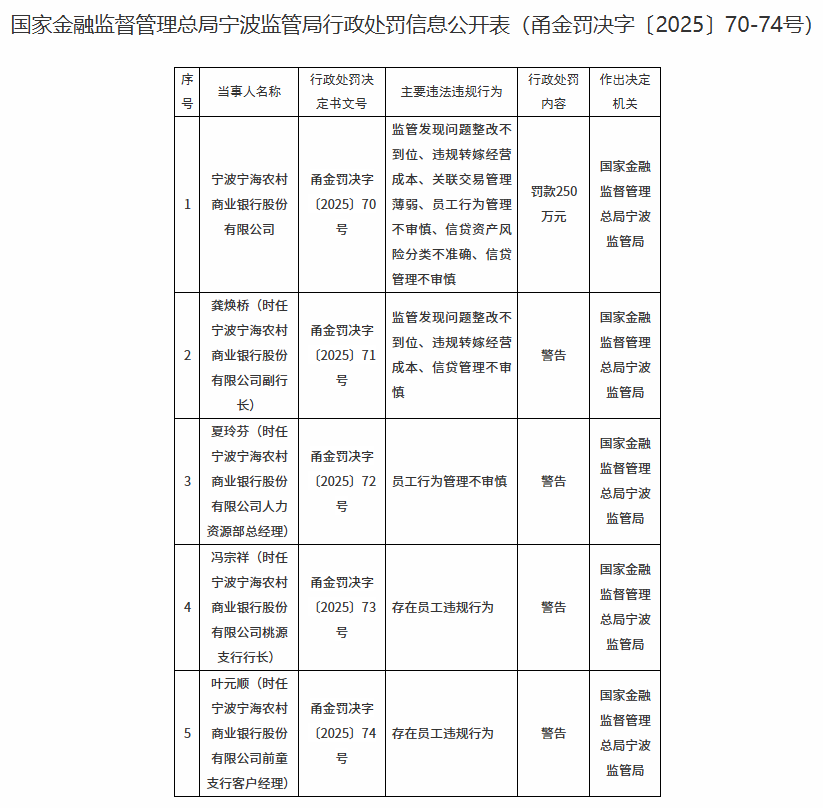 | 作出决定 | 序 | 当事人名称 | 行政处罚决 | 主要违法违规行为 | 行政处罚 | | | --- | --- | --- | --- | --- | --- | --- | | 를 | | | 定书文号 | | 内容 | 机关 | | 监管发现问题整改不 | 1 | 宁波宁海农村 | 角金罚决字 | | 罚款250 | 国家金融 | | 到位、违规转嫁经营 | | | | | | | | 成本、关联交易管理 | | | | | | | | 监督管理 | | | | | | | | (2025) 70 | | 商业银行股份 | | 薄弱、员工行为管理 | | | | 总局宁波 | | | | | 力元 | | | 有限公司 | | | 를 | 不审慎、信贷资产风 | | | | 监管局 | | | | 险分类不准确、信贷 | | | | 管理不审慎 | | | | | | | | 龚焕桥(时任 | 2 | 商业银行股份 | (2025) 71 | 监管发现问题整改不 | 醬告 | 国家金融 | | 宁波宁海农村 | | | 甬金罚决字 | | | | | 到位、违规转嫁经营 | | | | | | ...