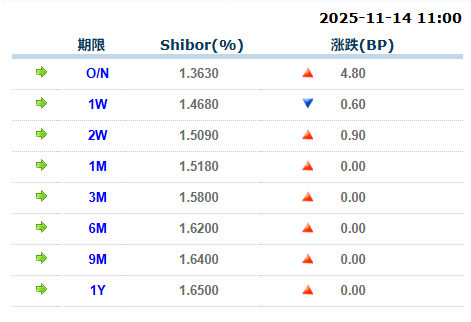 新华财经北京11月14日电(刘润榕)人民银行14日开展2128亿元7天期逆回购操作,操作利率为1.40%,与此前持平;鉴于当日有1417亿元7天期逆回购到 期,公开市场实现净投放711亿元。人民银行本周共进行11220亿元逆回购操作,因当周有4958亿元7天期逆回购到期,公开市场合计实现净投放6262亿 元。 上海银行间同业拆放利率(Shibor)隔夜品种止跌为升。具体来看,隔夜Shibor上涨4.80BP,报1.3630%;7天Shibor下跌0.60BP,报1.4680%;14天Shibor 上涨0.90BP,报1.5090%。 | | | | 2025-11-14 11:00 | | --- | --- | --- | --- | | | 期限 | Shibor(%) | 涨跌(BP) | | 价 | O/N | 1.3630 | 4.80 | | 中 | 1W | 1.4680 | 0.60 | | 价 | 2W | 1.5090 | 0.90 | | 价 | 1M | 1.5180 | 0.00 | | 价 | 3M | 1.5800 | 0.00 | | 中 | 6M | 1.6200 | 0.0 ...