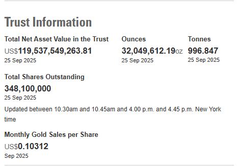 | Ounces | Tonnes | | --- | --- | | 32,049,612.19oz 996.847 | | | 25 Sep 2025 | 25 Sep 2025 | (文章来源:新华财经) 截至9月25日,全球最大黄金ETF——SPDR Gold Trust的黄金持仓量为996.85吨,与前一交易日持平。 ...