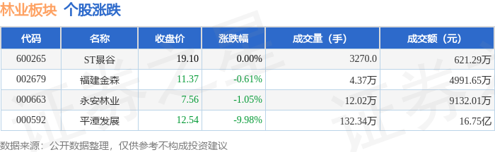 证券之星消息,1月16日林业板块较上一交易日下跌7.9%,平潭发展领跌。当日上证指数报收于 4101.91,下跌0.26%。深证成指报收于14281.08,下跌0.18%。林业板块个股涨跌见下表: | 代码 | 名称 |主力浄流入(元) | | | | 主力净占比 游资净流入(元) 游资净占比 散户净流入(元) 散户净占比 | | | | --- | --- | --- | --- | --- | --- | --- | --- | | 000663 永安林业 | | 756.48万 | 8.28% | 152.69万 | 1.67% | -909.17万 | -9.96% | | 600265 ST景谷 | | -21.23万 | -3.42% | 43.42万 | 6.99% | -22.20万 | -3.57% | | 002679 福建金森 | | -454.07万 | -9.10% | -224.12万 | -4.49% | 678.19万 | 13.59% | | 000592 平潭发展 | | -2.94亿 | -17.58% | -1587.12万 | -0.95% | 3.10/Z | 18 ...