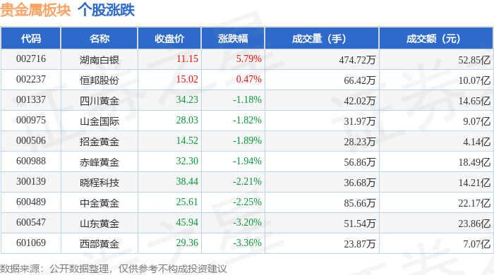 从资金流向上来看,当日贵金属板块主力资金净流出9.52亿元,游资资金净流入2.23亿元,散户资金净流 入7.3亿元。贵金属板块个股资金流向见下表: 证券之星消息,1月16日贵金属板块较上一交易日下跌1.9%,西部黄金领跌。当日上证指数报收于 4101.91,下跌0.26%。深证成指报收于14281.08,下跌0.18%。贵金属板块个股涨跌见下表: | 代码 | 名称 | 收盘价 | 涨跌幅 | 成交量(手) | 成交额(元) | | --- | --- | --- | --- | --- | --- | | 002716 | 湖南白银 | 11.15 | 5.79% | 474.72万 | 52.85 Z | | 002237 | 恒邦股份 | 15.02 | 0.47% | 66.42万 | 10.07亿 | | 001337 | 四川黄金 | 34.23 | -1.18% | 42.02万 | 14.65 Z | | 000975 | 山舍国际 | 28.03 | -1.82% | 31.97万 | 9.07亿 | | 000506 | 招金黄金 | 14.52 | -1.89% | 28.23万 | 4 ...