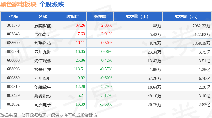 | 代码 | 名称 | 收盘价 | 涨跌幅 | 成交量(手) | 成交额(元) | | | --- | --- | --- | --- | --- | --- | --- | | 301578 | 辰奕智能 | 37.26 | 2.03% | 1.88万 | | 7032.22万 | | 002848 | *ST高斯 | 7.63 | 2.01% | 5.42万 | | 4122.82万 | | 688609 | 九联科技 | 10.11 | 0.50% | 8.78万 | | 8868.19万 | | 000801 | 四川九洲 | 16.05 | -0.06% | 23.34万 1 | | 3.75亿 | | 600060 | 海信视像 | 25.86 | -0.42% | 13.42万 | | 3.51亿 | | 688696 | 极米科技 | 118.51 | -0.57% | 1.05万 | | 1.25亿 | | 600839 | 四川长虹 | 9.92 | -0.60% | 67.26万 | | 6.70亿 | | 000810 | 创维数字 | 12.20 | -2.79% | 18.64万 ...