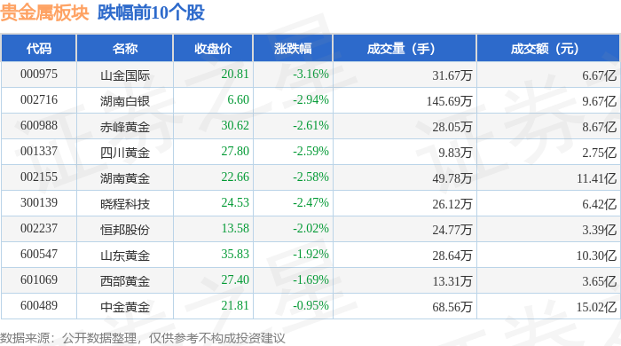 | 代码 | 名称 | 收盘价 | 涨跌幅 | 成交量(手) | 成交额(元) | | --- | --- | --- | --- | --- | --- | | 000688 | 国城矿业 | 25.22 | 3.40% | 58.94万 | 15.08亿 | | 002578 | 闽发铝业 | 5.00 | 2.67% | 315.43万 | 16.21亿 | | 002203 | 海亮股份 | 11.57 | 1.67% | 38.83万 | 4.52亿 | | 002540 | 亚太科技 | 7.11 | 1.43% | 20.40万 | 1.45亿 | | 000751 | 锌业股份 | 4.30 | 1.42% | 117.49万 | 5.11亿 | | 603115 | 海量股份 | 20.68 | 0.93% | 7.29万 | 1.53亿 | | 600768 | 宁波富邦 | 13.84 | 0.80% | 2.90万 | 4023.43万 | | 002996 | 顺博合金 | 8.52 | 0.71% | 28.03万 | 2.41亿 | | 600338 | 西藏朱峰 | 4 16. ...