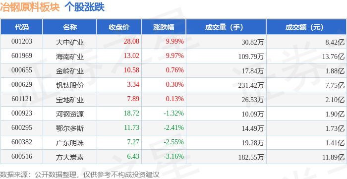 证券之星消息,11月14日冶钢原料板块较上一交易日上涨2.48%,大中矿业领涨。当日上证指数报收于 3990.49,下跌0.97%。深证成指报收于13216.03,下跌1.93%。冶钢原料板块个股涨跌见下表: | 代码 | 名称 | 收盘价 | 涨跌幅 | 成交量(手) | 成交额(元) | | --- | --- | --- | --- | --- | --- | | 001203 | 大中矿业 | 28.08 | 9.99% | 30.82万 | 8.42 Z | | 601969 | 一点题使 | 13.02 | 9.97% | 109.79万 | 13.76亿 | | 000655 | 等龄时,不 | 10.58 | 0.76% | - 17.84万 | 1.88 亿 | | 000629 | 钢钛股份 | 3.34 | 0.30% | 231.42万 | 7.75亿 | | 601121 | 宝地矿业 | 7.89 | 0.13% | 26.53万 | 2.10亿 | | 000923 | 河钢资源 | 18.72 | -1.32% | 10.09万 | 1.90 Z | | 600295 | 鄂尔 ...