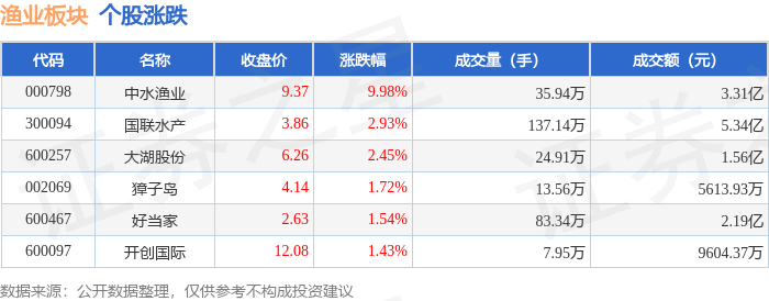 从资金流向上来看,当日渔业板块主力资金净流入1.37亿元,游资资金净流出5917.14万元,散户资金净 流出7823.16万元。渔业板块个股资金流向见下表: 证券之星消息,11月14日渔业板块较上一交易日上涨3.31%,中水渔业领涨。当日上证指数报收于 3990.49,下跌0.97%。深证成指报收于13216.03,下跌1.93%。渔业板块个股涨跌见下表: | 代码 | 名称 | 收盘价 | 涨跌幅 | 成交量(手) | 成交额(元) | | --- | --- | --- | --- | --- | --- | | 000798 | 中水渔业 | 9.37 | 9.98% | 35.94万 | 3.31 Z | | 300094 | 国联水产 | 3.86 | 2.93% | 137.14万 | 5.34亿 | | 600257 | 大湖股份 | 6.26 | 2.45% | 24.91万 | 1.56亿 | | 002069 | 獐子岛 | 4.14 | 1.72% | 13.56万 | 5613.93万 | | 600467 | 好当家 | 2.63 | 1.54% | 83.34万 | 2.19亿 | ...