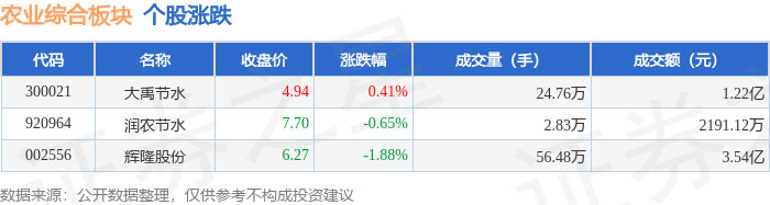 从资金流向上来看,当日农业综合板块主力资金净流出9091.66万元,游资资金净流入1116.69万元,散户 资金净流入7974.97万元。农业综合板块个股资金流向见下表: | | | | 代码 名称 主力净流入 (元) 主力净占比 游资净流入 (元) 游资净占比 散户净占比 | | | | | --- | --- | --- | --- | --- | --- | --- | | 300021 大禹节水 | 588.46万 | 4.81% | -1082.70万 | -8.84% | 494.24万 | 4.04% | | 002556 辉障股份 | -9680.12万 | -27.32% | 2199.39万 | 6.21% | 7480.73万 | 21.11% | 证券之星消息,11月14日农业综合板块较上一交易日下跌0.93%,辉隆股份领跌。当日上证指数报收于 3990.49,下跌0.97%。深证成指报收于13216.03,下跌1.93%。农业综合板块个股涨跌见下表: | 代码 | 名称 | 收盘价 | 涨跌幅 | 成交量(手) | 成交额(元) | | | --- | --- | --- | --- ...