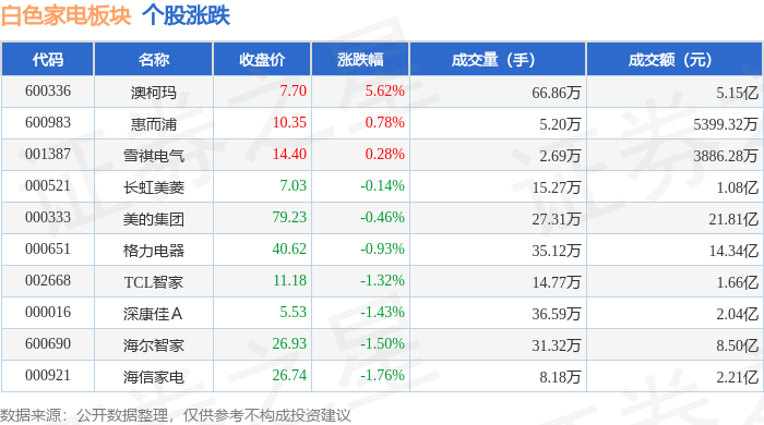 证券之星消息,11月14日白色家电板块较上一交易日下跌0.74%,海信家电领跌。当日上证指数报收于 3990.49,下跌0.97%。深证成指报收于13216.03,下跌1.93%。白色家电板块个股涨跌见下表: | 代码 | 名称 | 主力净流入(元) | 主力净占比 游资净流入 (元) | | 游资净占比 散户净流入(元) | | 散户净占比 | | --- | --- | --- | --- | --- | --- | --- | --- | | 600336 | 澳柯玛 | 5274.49万 | 10.24% | -2541.09万 | -4.94% | -2733.40万 | -5.31% | | 000333 | 美的集团 | 1000.38万 | 0.46% | 1037.82万 | 0.48% | -2038.20万 | -0.93% | | 000521 | 长虹美菱 | -113.07万 | -1.05% | -79.53万 | -0.74% | 192.60万 | 1.79% | | 001387 | 雪祺电气 | -128.67万 | -3.31% | -640.32万 | -16.48% ...