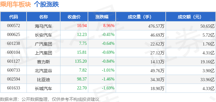 从资金流向上来看,当日乘用车板块主力资金净流出12.26亿元,游资资金净流入4.11亿元,散户资金净 流入8.15亿元。乘用车板块个股资金流向见下表: 证券之星消息,11月14日乘用车板块较上一交易日下跌0.93%,长城汽车领跌。当日上证指数报收于 3990.49,下跌0.97%。深证成指报收于13216.03,下跌1.93%。乘用车板块个股涨跌见下表: | 代码 | 名称 | 收盘价 | 涨跌幅 | 成交量(手) | 成交额(元) | | --- | --- | --- | --- | --- | --- | | 000572 | 世界中奥 | 10.94 | 8.96% | 476.57万 | 50.65 Z | | 000625 | 长安汽车 | 12.23 | -0.41% | 46.69万 | 5.72亿 | | 601238 | 广汽集团 | 7.75 | -0.64% | 22.62万 | 1.76亿 | | 600104 | 上汽集团 √ | 15.81 | -0.69% | 27.12万 | 4.31亿 | | 601127 | 赛力斯 | 135.20 | -0.84% | 14.13万 ...