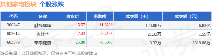 证券之星消息,11月14日其他家电板块较上一交易日上涨3.61%,融捷健康领涨。当日上证指数报收于 3990.49,下跌0.97%。深证成指报收于13216.03,下跌1.93%。其他家电板块个股涨跌见下表: | 代码 | 名称 | 收盘价 | 涨跌幅 | 成交量(手) | 成交额(元) | | | --- | --- | --- | --- | --- | --- | --- | | 300247 | 融捷健康 | 5.57 | 11.62% | 123.80万 | | 6.821Z | | 002614 | 奥佳华 | 7.43 | 0.41% | 21.33万 | | 1.59亿 | | 603579 | 荣泰健康 | 25.80 | -0.50% | 3.32万 | | 8619.88万 | | 代码 | | | 名称 │主力净流入(元)│主力净占比│游资净流入(元)│游资净占比│散户净流入(元)│散户净占比 | | | | | --- | --- | --- | --- | --- | --- | --- | | 300247 融捷健康 | 3012.64万 | 4.42% | -499.34万 | ...