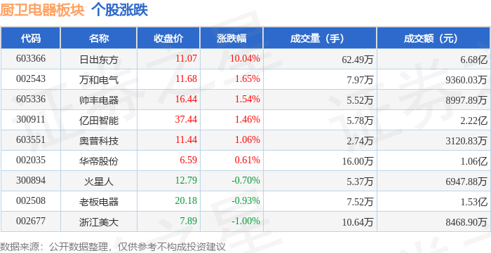 证券之星消息,11月14日厨卫电器板块较上一交易日上涨1.49%,日出东方领涨。当日上证指数报收于 3990.49,下跌0.97%。深证成指报收于13216.03,下跌1.93%。厨卫电器板块个股涨跌见下表: 从资金流向上来看,当日厨卫电器板块主力资金净流入2.6亿元,游资资金净流出1.11亿元,散户资金净 流出1.49亿元。厨卫电器板块个股资金流向见下表: | 代码 | 名称 | 主力净流入(元) | 主力净占比 游资净流入 (元) | | 游资净占比 散户净流入 (元) | | 散户净占比 | | --- | --- | --- | --- | --- | --- | --- | --- | | 603366 日出东方 | | 2.49 Z | 37.26% | -1.15 Z | -17.30% | -1.33 Z | -19.97% | | 300911 乙田智能 | | 2352.61万 | 10.62% | 435.76万 | 1.97% | -2788.36万 | -12.59% | | 002543 万和电气 | | 717.02万 | 7.66% | -38.67万 | -0.41% | - ...