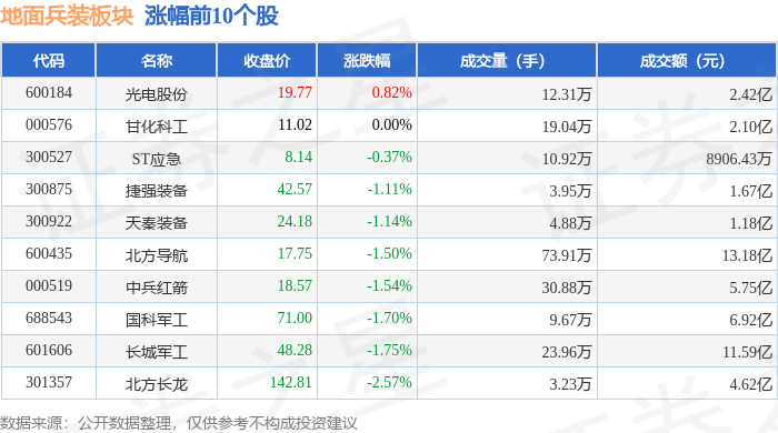 地面兵装板块市场表现 - 2025年1月16日,地面兵装板块整体下跌2.39%,表现弱于大盘,当日上证指数下跌0.26%,深证成指下跌0.18% [1] - 板块内个股普跌,领跌股为银河电子,股价下跌9.99% [1][2] - 板块内仅少数个股上涨,光电股份上涨0.82%,甘化科工股价持平 [1] 板块个股交易情况 - 北方导航成交额最高,达13.18亿元,成交量73.91万手,股价下跌1.50% [1][2] - 长城军工成交额11.59亿元,股价下跌1.75% [1][2] - 内蒙一机成交额11.22亿元,股价下跌4.02% [2] - 银河电子成交额1.85亿元,成交量19.98万手 [2] - 天秦装备成交额1.18亿元,股价下跌1.14% [1][2] - ST应急成交额8906.43万元,股价下跌0.37% [1][2] 板块资金流向 - 当日地面兵装板块整体呈现主力资金净流出,净流出金额为6.71亿元 [2] - 游资资金净流入9882.47万元,散户资金净流入5.73亿元 [2] - 北方导航主力资金净流出最多,达1.31亿元,主力净占比-9.92% [3] - 北方长龙主力资金净流出7758.16万元,主力净占比-16.79% [3] - 中兵红箭主力资金净流出5333.32万元,主力净占比-9.28% [3] - 银河电子主力资金净流出4417.20万元,主力净占比-23.82% [3] - 国科军工主力资金净流出1558.72万元,但获得游资净流入2235.23万元 [3] - 甘化科工是少数获得主力资金净流入的个股,净流入592.93万元,主力净占比2.82% [3]