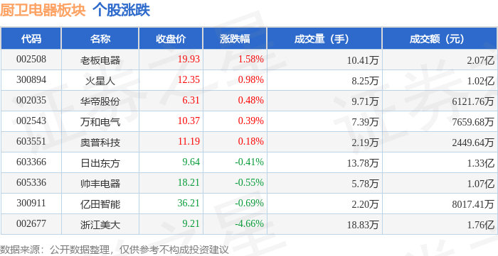 厨卫电器板块市场表现 - 2024年1月20日,厨卫电器板块整体上涨0.08%,表现略强于当日上证指数(下跌0.01%)和深证成指(下跌0.97%)[1] - 板块内个股涨跌互现,老板电器以1.58%的涨幅领涨,收盘价为19.93元,成交额为2.07亿元,成交量为10.41万手[1] - 火星人上涨0.98%,收盘价12.35元,成交额1.02亿元,成交量8.25万手[1] - 华帝股份上涨0.48%,收盘价6.31元,成交额6121.76万元,成交量9.71万手[1] - 万和电气上涨0.39%,收盘价10.37元,成交额7659.68万元,成交量7.39万手[1] - 奥普科技上涨0.18%,收盘价11.19元,成交额2449.64万元,成交量2.19万手[1] - 日出东方下跌0.41%,收盘价9.64元,成交额1.33亿元,成交量13.78万手[1] - 帅丰电器下跌0.55%,收盘价18.21元,成交额1.07亿元,成交量5.78万手[1] - 亿田智能下跌0.69%,收盘价36.21元,成交额8017.41万元,成交量2.20万手[1] - 浙江美大跌幅最大,下跌4.66%,收盘价9.21元,成交额1.76亿元,成交量18.83万手[1] 厨卫电器板块资金流向 - 当日厨卫电器板块整体呈现主力资金和游资净流出,散户资金净流入的格局[1] - 板块主力资金净流出1374.98万元,游资资金净流出1081.39万元,散户资金净流入2456.37万元[1] - 老板电器获得主力资金净流入1652.58万元,主力净占比7.99%,但游资净流出1288.77万元,散户净流出363.81万元[2] - 火星人获得主力资金净流入611.12万元,主力净占比5.99%,同时获得游资净流入479.55万元,但散户净流出1090.66万元[2] - 帅丰电器获得主力资金净流入432.06万元,主力净占比4.02%,但游资净流出957.63万元,散户净流入525.57万元[2] - 华帝股份获得主力资金净流入148.65万元,主力净占比2.43%,但游资净流出184.25万元,散户净流入35.60万元[2] - 亿田智能主力资金净流出390.66万元,主力净占比-4.87%,游资净流入19.51万元,散户净流入371.14万元[2] - 奥普科技主力资金净流出429.69万元,主力净占比-17.54%,游资净流入258.46万元,散户净流入171.24万元[2] - 万和电气主力资金净流出796.70万元,主力净占比-10.40%,游资净流入13.06万元,散户净流入783.64万元[2] - 日出东方主力资金净流出1299.77万元,主力净占比-9.78%,游资净流入820.32万元,散户净流入479.45万元[2] - 浙江美大主力资金净流出1302.56万元,主力净占比-7.42%,游资净流出241.63万元,散户净流入1544.19万元[2]