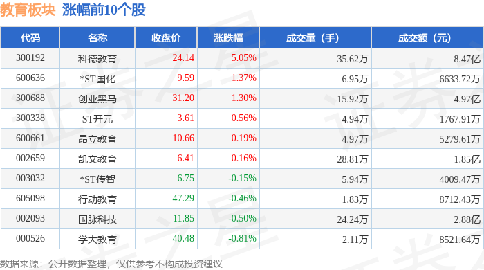 从资金流向上来看,当日教育板块主力资金净流出2.28亿元,游资资金净流入1997.93万元,散户资金净 流入2.08亿元。教育板块个股资金流向见下表: 证券之星消息,1月19日教育板块较上一交易日下跌0.8%,ST东时领跌。当日上证指数报收于4114.0,上 涨0.29%。深证成指报收于14294.05,上涨0.09%。教育板块个股涨跌见下表: | 代码 | 名称 | 收盘价 | 涨跌幅 | 成交量(手) | 成交额(元) | | | --- | --- | --- | --- | --- | --- | --- | | 300192 | 科德教育 | 24.14 | 5.05% | 35.62万 | | 8.47亿 | | 600636 | *ST国化 | 9.59 | 1.37% | 6.95万 | | 6633.72万 | | 300688 | 创业等号 | 31.20 | 1.30% | 15.92万 | | 4.97亿 | | 300338 | ST开元 | 3.61 | 0.56% | 4.94万 | | 1767.91万 | | 600661 | 昂立教育 | 10.66 | 0.19% | 4 ...