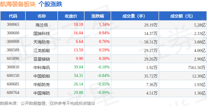 证券之星消息,11月14日航海装备板块较上一交易日下跌0.65%,中国海防领跌。当日上证指数报收于 3990.49,下跌0.97%。深证成指报收于13216.03,下跌1.93%。航海装备板块个股涨跌见下表: | 代码 | 名称 | 收盘价 | 涨跌幅 | 成交量(手) | 成交额(元) | | --- | --- | --- | --- | --- | --- | | 300065 | 海兰信 | 18.18 | 1.34% | 29.19万 | 5.28 Z | | 300600 | 国瑞科技 | 16.04 | 0.94% | 14.37万 | 2.33亿 | | 300008 | 天海防务 | 6.64 | 0.76% | 58.31万 | 3.88 Z | | 300589 | 江龙船艇 | 13.59 | 0.59% | 29.27万 ﻟ | 4.00亿 | | 601890 | 亚星锚链 | 9.90 | 0.30% | 29.26万 | 2.90亿 | | 300810 | 武夷君 | 39.04 | -0.18% | 1.92万 | 7561.50万 | | 600150 | 中国船舶 | ...