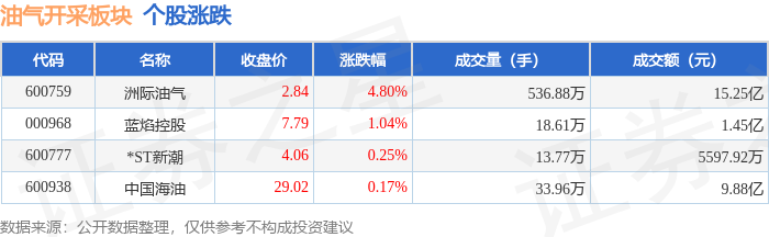 板块市场表现 - 油气开采板块在11月14日整体上涨0.63%,表现优于大盘,当日上证指数下跌0.97%,深证成指下跌1.93% [1] - 洲际油气领涨板块,收盘价为2.84元,涨幅达4.80%,成交量为536.88万手,成交额为15.25亿元 [1] - 板块内其他个股表现不一,蓝焰控股上涨1.04%,*ST新潮上涨0.25%,中国海油上涨0.17% [1] 板块资金流向 - 油气开采板块整体获得主力资金净流入2112.87万元,游资资金净流入700.87万元,但散户资金净流出2813.75万元 [1] - 洲际油气获得主力资金净流入5047.91万元,主力净占比为3.31%,是板块内资金关注度最高的个股 [2] - 中国海油呈现主力资金净流出3075.31万元,主力净占比为-3.11%,但获得游资净流入858.92万元 [2] - 蓝焰控股获得主力资金净流入600.87万元,而*ST新潮则出现主力资金净流出460.59万元 [2]