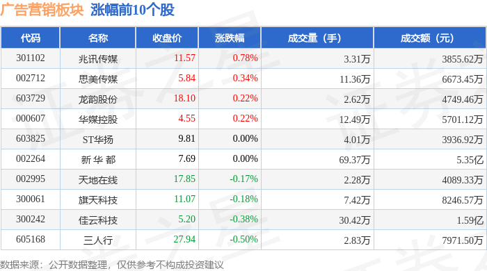 从资金流向上来看,当日广告营销板块主力资金净流出12.42亿元,游资资金净流入4.49亿元,散户资金 净流入7.93亿元。广告营销板块个股资金流向见下表: 以上内容为证券之星据公开信息整理,由AI算法生成(网信算备310104345710301240019号),不构成投资建议。 | 代码 | 名称 | 收盘价 | 涨跌幅 | 成交量(手) | 成交额(元) | | | --- | --- | --- | --- | --- | --- | --- | | 301171 | 易点天下 | 29.19 | -6.80% | 25.18万 | | 7.50亿 | | 300058 | 蓝色光标 | 7.73 | -6.76% | 509.11万 | | 40.40 Z | | 300781 | 因赛集团 | 36.36 | -6.02% | 6.72万 | | 2.50亿 | | 300071 | 福石控股 | 5.48 | -6.00% | 118.04万 | | 6.58亿 | | 002878 | 元隆雅图 | 18.92 | -3.72% | 23.01万 | | 4.48亿 | | 300612 | 宣亚 ...