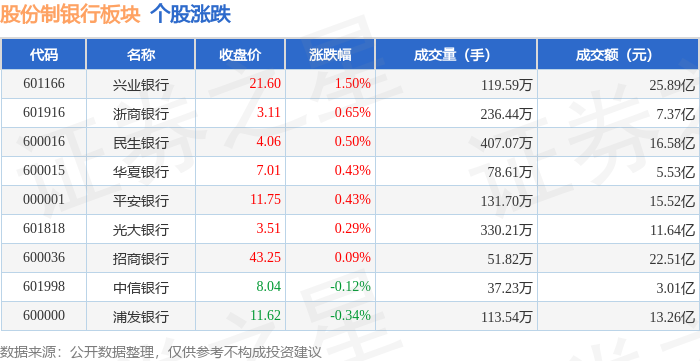 以上内容为证券之星据公开信息整理,由AI算法生成(网信算备310104345710301240019号),不构成投资建议。 从资金流向上来看,当日股份制银行板块主力资金净流入2.68亿元,游资资金净流出2.65亿元,散户资 金净流出270.98万元。股份制银行板块个股资金流向见下表: 证券之星消息,11月14日股份制银行板块较上一交易日上涨0.32%,兴业银行领涨。当日上证指数报收 于3990.49,下跌0.97%。深证成指报收于13216.03,下跌1.93%。股份制银行板块个股涨跌见下表: | 代码 | 名称 | 收盘价 | 涨跌幅 | 成交量(手) | 成交额(元) | | --- | --- | --- | --- | --- | --- | | 601166 | 兴业银行 | 21.60 | 1.50% | 119.59万 | 25.89 乙 | | 601916 | 浙商银行 | 3.11 | 0.65% | 236.44万 | 7.37 Z | | 600016 | 民生银行 | 4.06 | 0.50% | 407.07万 | 16.58亿 | | 600015 | 华夏银行 | 7.01 | ...