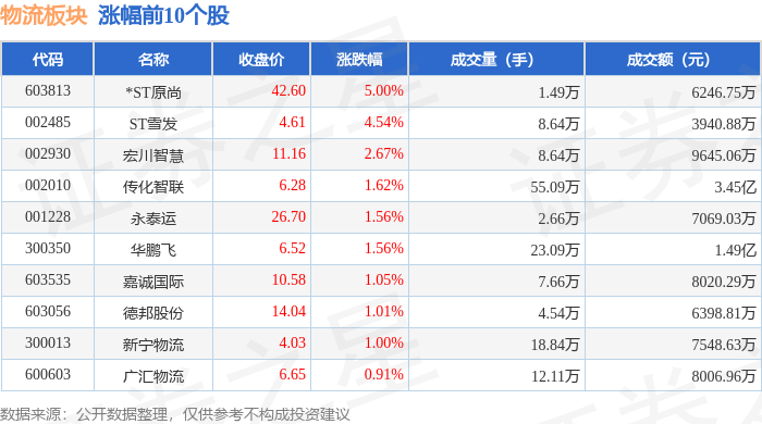 证券之星消息,1月9日物流板块较上一交易日上涨0.33%,*ST原尚领涨。当日上证指数报收于4120.43, 上涨0.92%。深证成指报收于14120.15,上涨1.15%。物流板块个股涨跌见下表: 以上内容为证券之星据公开信息整理,由AI算法生成(网信算备310104345710301240019号),不构成投资建议。 | 代码 | 名称 | 收盘价 | 涨跌幅 | 成交量(手) | 成交额(元) | | --- | --- | --- | --- | --- | --- | | 002492 | 恒基达整 | 8.45 | -2.09% | 15.00万 | 1.26亿 | | 600753 | *ST海钦 | 8.26 | -1.20% | 2.09万 | 1727.28万 | | 002769 | 普路通 | 11.36 | -0.96% | 18.36万 | 2.09亿 | | 603967 | 中创物流 | 13.01 | -0.91% | 8.49万 | 1.11亿 | | 601156 | 东航物流 | 18.13 | -0.87% | 15.07万 | 2.73亿 | | 002682 | ...