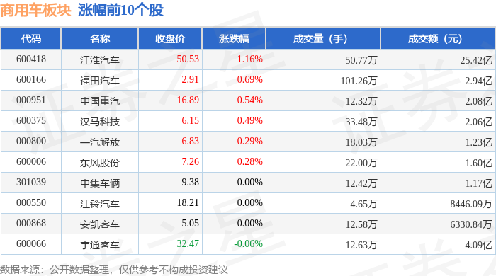 证券之星消息,1月9日商用车板块较上一交易日上涨0.41%,江淮汽车领涨。当日上证指数报收于 4120.43,上涨0.92%。深证成指报收于14120.15,上涨1.15%。商用车板块个股涨跌见下表: | 代码 | 名称 | 收盘价 | 涨跌幅 | 成交量(手) | 成交额(元) | | | --- | --- | --- | --- | --- | --- | --- | | 600418 | 江淮汽车 | 50.53 | 1.16% | 50.77万 | | 25.42 Z | | 600166 | 福田汽车 | 2.91 | 0.69% | 101.26万 | | 2.94亿 | | 000951 | 中国重汽 | 16.89 | 0.54% | 12.32万 | | 2.08亿 | | 600375 | 汉马科技 | 6.15 | 0.49% | 33.48万 | | 2.06亿 | | 000800 | 一汽解放 | 6.83 | 0.29% | 18.03万 | | 1.23亿 | | 600006 | 东风股份 | 7.26 | 0.28% | 22.00万 | | 1.60亿 | | 3010 ...