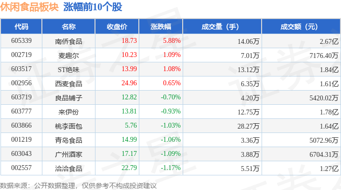 板块整体表现 - 休闲食品板块在交易日整体下跌1.44%,表现弱于大盘,同期上证指数下跌0.97%,深证成指下跌1.93% [1] - 板块内个股表现分化,元祖股份领跌,跌幅为3.46%,盐津铺子和立高食品跌幅紧随其后,均为3.16% [1][2] - 南侨食品逆势上涨5.88%,为板块中涨幅最大的个股,麦趣尔和ST绝味分别上涨1.09%和1.08% [1] 个股价格与交易情况 - 万辰集团收盘价最高,为178.10元,但当日下跌3.14%,南侨食品收盘价为18.73元,涨幅5.88% [1][2] - 桃李面包成交量最大,为28.27万手,成交额为1.64亿元,桂发祥成交量为17.35万手,成交额为2.47亿元 [1][2] - 盐津铺子成交额最高,达3.17亿元,股价下跌3.16%,三只松鼠成交额为3.22亿元,股价下跌2.27% [2] 板块资金流向 - 休闲食品板块整体呈现主力资金和游资净流出,主力资金净流出2.07亿元,游资资金净流出7644.9万元 [2] - 散户资金整体净流入2.83亿元,与主力资金流向形成对比 [2] - 南侨食品获得主力资金净流入4396.32万元,主力净占比16.46%,为板块最高 [3] - ST绝味和良品铺子分别获得主力资金净流入1475.37万元和258.38万元,主力净占比分别为8.00%和4.77% [3] - 广州酒家、西麦食品和青岛食品主力资金净流出居前,净流出金额分别为740.53万元、676.94万元和528.91万元 [3]