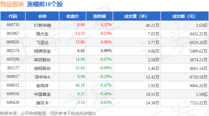 证券之星消息,11月14日饰品板块较上一交易日下跌0.64%,潮宏基领跌。当日上证指数报收于 3990.49,下跌0.97%。深证成指报收于13216.03,下跌1.93%。饰品板块个股涨跌见下表: | 代码 | 名称 | 收盘价 | 涨跌幅 | 成交量(手) | 成交额(元) | | --- | --- | --- | --- | --- | --- | | 600735 | ST新华锦 | 6.68 | - 4.37% | 40.21万 | 2.63亿 | | 002867 | 周大生 | 13.33 | 0.23% | 7.05万 | 9452.25万 | | 000026 | 飞亚达 | 15.86 | 0.06% | 3.77万 | 6029.26万 | | 002574 | 明牌珠宝 | 6.02 | 0.00% | 9.06万 | 5489.62万 | | 665509 | 菜自股份 | 14.96 | -0.07% | 2.58万 | 3874.21万 | | 301177 | 迪阿股份 | 31.64 | -0.09% | 1.46万 | 4661.14万 | | 000017 | 深中华A ...