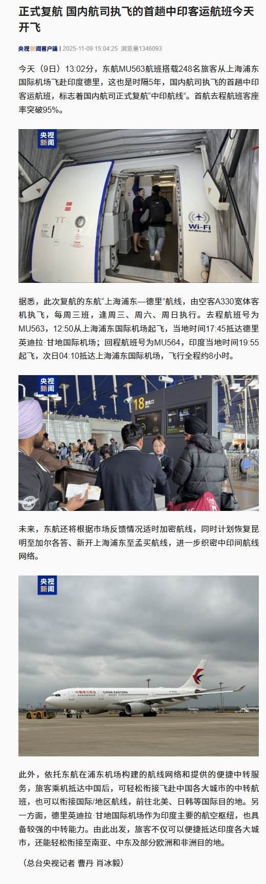 #中印客运航班正式复航#【正式复航 国内航司执飞的首趟中印客运航班今天开飞】今天(9日)13:02 分,东航MU563航班搭载248名旅客从上海浦东国际机场飞赴印度德里,这也是时隔5年,国内航司执 飞的首趟中印客运航班,标志着国内航司正式复航"中印航线"。首航去程航班客座率突破95%。(央 视) 未来,东航还将根据市场反馈情况适时加密航线,同时计划恢复昆 明至加尔各答、新开上海浦东至孟买航线,进一步织密中印间航线 网络。 此外,依托东航在浦东机场构建的航线网络和提供的便捷中转服 务,旅客乘机抵达中国后,可轻松衔接飞赴中国各大城市的中转航 班,也可以衔接国际/地区航线,前往北美、日韩等国际目的地。另 一方面,德里英迪拉·甘地国际机场作为印度主要的航空枢纽,也具 备较强的中转能力。由此出发,旅客不仅可以便捷抵达印度各大城 市,还能轻松衔接至南亚、中东及部分欧洲和非洲目的地。 (总台央视记者 曹丹 肖冰毅) ...