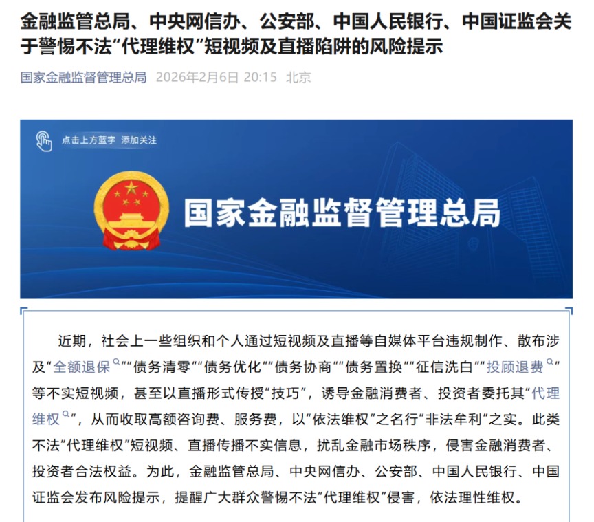 核心观点 - 五部门联合发布风险提示,揭露并警示通过短视频及直播平台传播的不法“代理维权”活动,此类活动以“依法维权”之名行“非法牟利”之实,严重扰乱金融市场秩序并侵害金融消费者与投资者权益 [1][5] 不法“代理维权”的主要特征 - **谎称“监管部门出新政”**:以监管部门强化监管或出台新规为名,散布“全额退保”、“债务回收清零”、“债务置换”、“证监会新政,X月退费通道开通”等不实信息,错误引用或曲解政策规定,或拼接监管人员照片与无关政策以混淆视听 [6][7] - **谎称“金融机构有活动”**:宣称金融机构开展“全额退保”、“延期还款”、“全民清债”等活动,并配以金融机构营业场所或标识渲染真实性,例如声称“退保通道已打开”、“各大行已开通延迟还款通道” [7] - **宣称“专业律师专业维权”**:冠以“专业法律咨询”或“律师事务所”名义,传递“保险业务员代签名即可获取全额退保”、“信用卡协商分期有一个万能电话”等误导信息,并展示“6天时间拿回5000元机构退费”等虚假案例,公开传授所谓维权技巧以推介服务并收取高额费用 [7] - **使用其他煽动性话术**:通过“血本无归”、“A股股灾”等唱空股市的话术及投资者亏损案例进行诱导营销,煽动投资者联系“代理维权”机构 [8] 对金融消费者与投资者的影响及警示 - 金融消费者与投资者勿听信“全额退保”、“贷款/信用卡不用还”、“债务协商”、“征信洗白”、“投顾费用全退”等不实信息,应通过监管部门官网、金融机构官方客服等正规渠道获取信息与服务,避免上当受骗 [10] - 听信“代理维权”虚假宣传可能导致支付高额服务费,中途退出甚至可能因“违约”陷入官司 [10] - “代理维权”组织伺机收集消费者与投资者的手机卡、银行卡、贷款、信用卡、保单、家庭住址、身份信息等个人重要信息,此类信息一旦被非法买卖或利用,当事人可能面临电信网络诈骗、信用卡盗刷等风险 [10] - 遇金融纠纷应通过金融机构官方渠道、金融管理部门、专业调解组织或诉讼、仲裁等合法途径解决 [10] 对市场秩序的影响与监管行动 - “代理维权”组织从事“全额退保”、“反催收”、“债务优化”、“征信洗白”、“投顾退费”等虚假宣传与活动,严重扰乱金融市场秩序,涉嫌违反法律法规 [11] - 金融消费者与投资者若发现短视频、直播存在上述违法违规问题,可向网站平台或金融监管、网信、公安部门举报 [11] - “代理维权”组织唆使消费者提供虚假材料、恶意逃废债务、发起不实投诉举报向金融机构施压,情节严重的可能涉嫌违法犯罪 [11] - 国家金融监督管理总局此前多次发布风险提示,指出非法代理机构泛滥不仅导致用户被骗案件,更严重损害金融机构和平台利益,扰乱金融行业健康秩序 [11] - 证监会部分地方监管局也曾提示,不法组织以“代理投诉”、“全额退费”等名义诱导投资者支付高额费用,并通过教唆虚构事实、伪造证据进行恶意投诉,严重扰乱市场秩序并侵害投资者权益 [12]