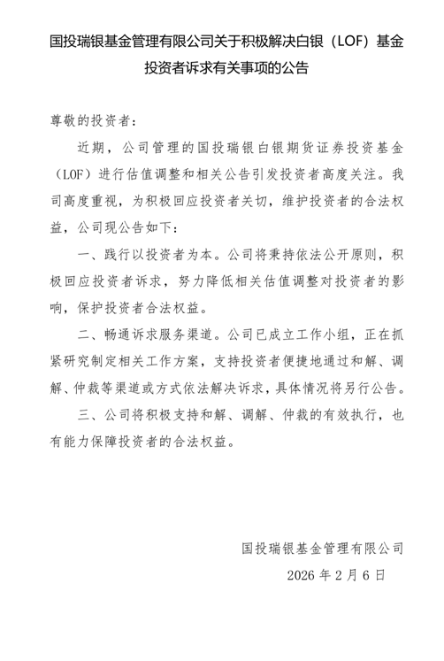 公司公告核心内容 - 国投瑞银基金发布公告 就国投白银LOF近期实施的估值调整及发布的相关公告引发的投资者高度关注进行回应 [1] - 公司表示将秉持依法公开原则 积极回应投资者诉求 努力降低相关估值调整对投资者的影响 保护投资者合法权益 [4] - 公司已成立工作小组 正在抓紧研究制定相关工作方案 支持投资者便捷地通过和解、调解、仲裁等渠道或方式依法解决诉求 具体情况将另行公告 [4] 公司具体措施与承诺 - 公司将积极支持和解、调解、仲裁的有效执行 并表示有能力保障投资者的合法权益 [4] - 公司表示将高度重视并充分尊重每一位投资者 认真听取意见 [4] - 公司将继续通过热线电话、官方邮件等方式与投资者积极沟通 [4]