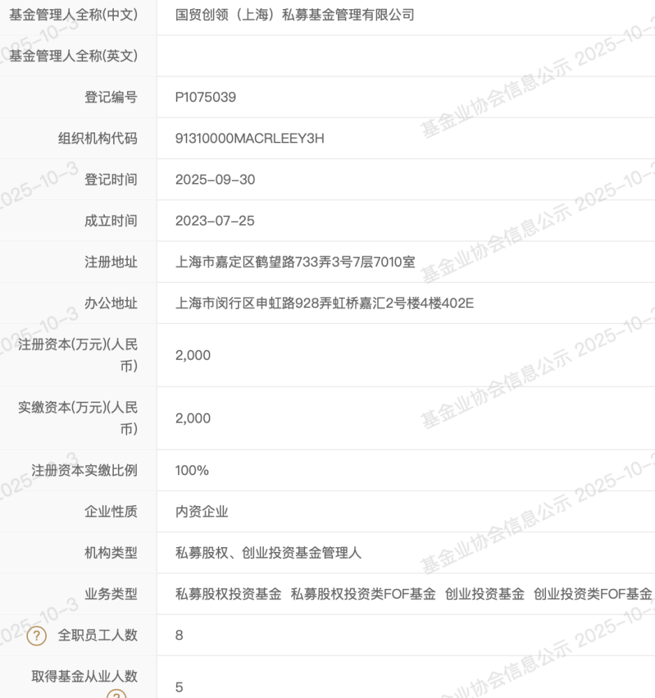 【导读】厦门国贸旗下私募正式完成备案,原公募老将董晓亮担任法定代表人 中国基金报记者吴君 | | 职务 | 法定代表人 | . Will 11 | 姓名 董晓亮 | | | --- | --- | --- | --- | --- | --- | | | 是否有基金从业资格 | 是 | | 资格获取方式 通过考试 | | | 3 | | | | | | | | | 时间 | 任职单位 ~99 | 任职部门 | 职务 | | | | 2023.09 - | 国贸创领(上海)私募基金管理 | 国贸创领(上海)私募基金管理 | 法定代表人 | | | | | 有限公司 | 有限公司董事会 | | | | | 2023.07 - 2023.09 | 国贸创领(上海)投资有限公司 | 无 | 董事长 | | 3 | | 2022.06 - 2023.06 | 太平基金管理有限公司 △ | 3 太平基金管理有限公司公司领导 | 副总经理 | | | | 2022.06 - 2022.06 | 太平基金管理有限公司 | 太平基金管理有限公司公司领导 | 副总经理 | | | | 2019.11 - 2022.04 | " 世 ...