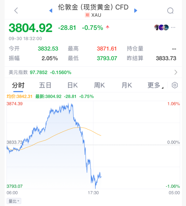 【导读】黄金大跳水 大家好,刚刚创下新高的黄金,突然大跳水了。 一起看看发生了什么事情。 华盛顿的僵局是提振黄金避险吸引力的最新动因,此外还有对特朗普贸易战经济影响的担忧以及地缘政 治紧张。黄金今年以来已累计上涨约45%,有望创下自1979年以来的最大年度涨幅。 周一,国会两院领袖与特朗普的会面未能就政府的短期融资达成协议。这加剧了对政府关门的担忧,而 关门可能会阻碍经济数据的发布——使投资者无法获得评估美国经济所需的关键信息。 各国央行的购金需求以及美联储恢复降息也为金价提供了支撑。高盛集团和德意志银行认为金价仍有进 一步上涨空间。 瑞银周二在一份报告中称,对黄金市场目前倾向于看涨情景,预计到2026年年中金价将升至每盎司4200 美元。该行指出,美元走弱、央行大举购买黄金以及ETF投资增加等因素对金价构成利好,同时建议黄 金在投资组合中的配置比例为5%左右。瑞银强调,黄金与股票和债券的关联度较低,可作为对冲通胀 和地缘政治风险的工具,同时提醒投资者考虑与价格波 现货白银的价格也同步下跌。 萨克索银行商品策略师奥勒·斯洛特·汉森表示:"在整个9月不间断的上涨之后,我认为目前出现了一些 月末获利了结,我也怀疑 ...