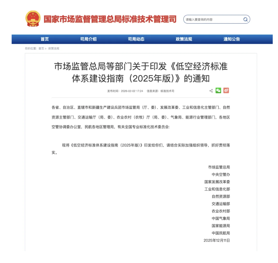 政策发布与目标 - 市场监管总局等十部委于2月2日联合发布《低空经济标准体系建设指南(2025年版)》[1] - 该指南旨在系统推进低空经济高质量发展,发挥标准化的基础性和引领性作用,形成全国“一盘棋”工作格局[1] - 指南设定明确时间目标:到2027年,低空经济标准体系基本建立[2];到2030年,低空经济领域标准超过300项,形成结构优化、先进合理、国际兼容的标准体系[2] 标准体系建设框架 - 指南围绕五大核心领域构建标准体系:低空航空器、低空基础设施、低空空中交通管理、安全监管和应用场景[1] - 致力于建立“四维融合”的标准供给体系,即技术标准与管理规范、国内标准与国际规则、强制性标准与推荐性标准、基础标准与场景标准相融合[1] - 强化标准全生命周期管理,构建央地协同、产学研联动的标准化创新生态[1] 具体标准领域细分 - 低空航空器标准涵盖基础共性、管理、安全、无人驾驶航空器系统和有人驾驶航空器标准[2] - 低空基础设施标准包括低空智能网联系统、起降基础设施、飞行管理服务保障基础设施、质量技术基础设施、安全防护基础设施等[2] - 应用场景标准覆盖农业、交通、能源、测绘、文旅、体育、医疗救护、气象、国土、海洋等多个领域[2] 行业发展阶段与生态 - 当前中国低空经济已进入产业化加速期[1] - 行业已形成贯穿技术研发、装备制造、运营服务、基础设施的全链条生态体系[1]
