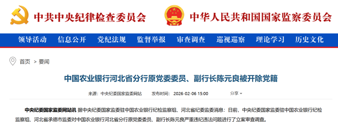 金融反腐事件 - 中国农业银行河北省分行原党委委员、副行长陈元良因严重违纪违法被开除党籍,其涉嫌犯罪问题已移送检察机关审查起诉 [1][3][4] - 陈元良被查实的问题包括:丧失理想信念、对抗组织审查、违反中央八项规定精神、违反组织原则、廉洁底线失守、不正确履行职责、利用职务便利在贷款审批及项目承揽中为他人谋利并非法收受巨额财物 [3] - 陈元良在中国农业银行工作多年,曾任邯郸分行副行长、河北省分行公司业务部总经理等职,于2012年出任河北省分行党委委员、副行长,于2025年5月因涉嫌严重违纪违法接受审查调查 [4] 涉事银行内部治理 - 依据《中国共产党纪律处分条例》《中华人民共和国监察法》等规定,中国农业银行党委决定给予陈元良开除党籍处分,并取消其享受的待遇,收缴其违纪违法所得 [4] - 近年来中国农业银行河北省分行已有多名干部被查,包括原高级专家宋雷、原党委委员及副行长赵立宏、原党委副书记及副行长王振林等,目前均已被通报处理 [4] - 其他被查干部的具体问题包括:宋雷为信贷客户在办理贷款方面谋利并非法收受巨额财物,在审批增量授信时严重失职导致国有资产遭受特别重大损失 [5];赵立宏以民间借贷为幌子谋取巨额利益,在信贷业务上为企业提供帮助并非法收受钱款 [5];王振林违反国家区域信贷政策发放贷款并形成不良,利用职务便利索取及收受巨额财物,违反国家法律法规发放贷款 [5]