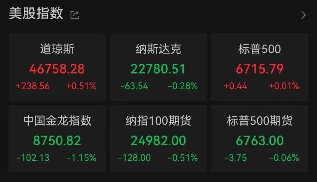 【导读】美股科技巨头回调,纳斯达克指数收跌0.28%。关税大消息传出,部分汽车股短线走高 中国基金报记者储是 美股科技巨头回调带动纳指下跌。据报道,特朗普考虑对在美最终组装的汽车给予重大关税减免,部分汽车股短线走高。 中国金龙指数本周累计上涨2.58%,中概互联和汽车板块周五回调。 伯克希尔调整公司权力结构。特朗普对哈马斯"最后通牒"见效,油价结束连跌。 美国政府持续"关门" 美股三大指数涨跌不一 美东时间10月3日(周五),美股三大指数涨跌不一,科技股回调带动纳斯达克指数下跌。道琼斯指数和标普指数收涨,并创下新高。 截至收盘,道琼斯指数上涨0.51%,报46758.28点;标普500指数上涨0.01%,报6715.79点;纳斯达克指数下跌0.28%,报22780.51点。 中概互联网、汽车股回调 由于美国劳工部暂停几乎所有经济活动,盘前未发布9月份非农就业报告。盘后,美国参议院再度否决了两党提出的临时拨款法案,联邦政府将持续"关 门"。 非农数据是影响美股走势的关键要素,同时也是美联储决议的参考数据。芝商所"美联储观察"工具显示,市场预计本月降息25个基点的概率接近95%。 科技巨头回调 汽车股盘中短线走高 ...