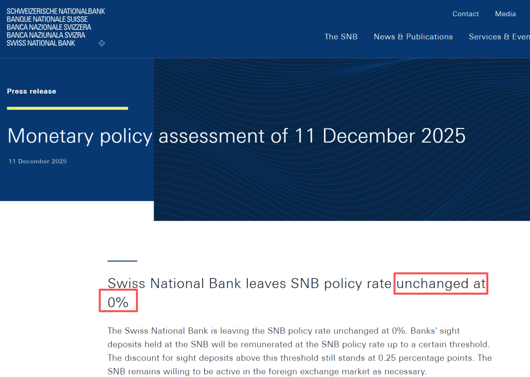 瑞士央行利率决议 - 瑞士国家银行于12月11日宣布维持政策利率在0%不变 符合市场普遍预期 [1][4][8] - 央行声明指出 仍准备在必要时积极干预外汇市场 [4] 经济与通胀状况 - 近几个月通胀略低于预期 中期通胀压力与上次评估相比几乎未变 [5] - 通胀率自8月的0.2%降至11月的0% 主要因酒店业 租金及服装等领域价格涨幅放缓 [5] - 瑞士第三季度GDP出现收缩 主要受制药行业拖累 其他制造业和服务业小幅增长 [6] - 由于整体经济发展疲软 近几个月失业率进一步上升 [6] - 得益于美国关税下调及全球经济形势略有好转 瑞士经济前景略有改善 [6] - 央行预计2025年GDP增速略低于1.5% 2026年增速约为1% 在此环境下失业率可能继续小幅上升 [6] 通胀与利率预期调整 - 基于0%的利率假设 瑞士央行将2026年通胀预期从0.5%下调至0.3% 将2027年通胀预期从0.7%下调至0.6% [6] - 有分析指出 若2026年通胀预测被下调至0.2%或接近零 可能释放政策层真正担忧的信号 并令负利率选项被更严肃地考虑 [9] 市场反应与汇率影响 - 消息公布后 瑞士法郎小幅走强 美元兑瑞士法郎汇率下跌0.15% 处于11月中旬以来低位 [4] - 具体数据显示 美元兑瑞士法郎汇率报0.7984 下跌0.0012 跌幅0.1501% [5] 政策背景与市场观点 - 经济学家普遍认为 尽管瑞士央行素以“出其不意”著称 但当前决策层不会贸然采取可能损害本国金融体系稳定性的举措 即再度将政策利率推入负值区间 [8] - 瑞士央行于今年6月将利率下调25个基点至0% 成为首家重返“0利率”的央行 该次降息是自2024年3月启动宽松周期以来的第六次降息 [8] - 瑞士央行主席马丁·施莱格尔曾在9月表示 考虑到对储户 银行利润和养老基金的冲击 将利率降至负值区域的门槛高于在正利率时降息的门槛 [8] - 近期公布的通胀数据低于央行先前预测 曾促使市场略微增加对降息至负利率的预期 但在美国与瑞士达成贸易协议后 此类押注已经缩减 [8] - 根据美瑞贸易协议 自11月14日起 美国对瑞士商品征收的关税税率已从39%降至15% [8]