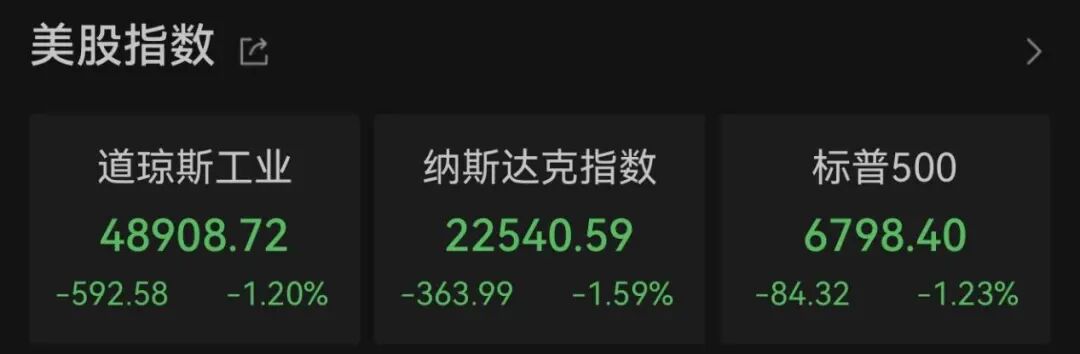 美股市场表现 - 道琼斯工业平均指数下跌592.58点,跌幅1.20%,收于48908.72点 [2] - 纳斯达克综合指数下跌363.99点,跌幅1.59%,收于22540.59点 [2] - 标普500指数下跌84.32点,跌幅1.23%,收于6798.40点,抹去了今年以来的全部涨幅 [1][2] - 美国科技七姐妹指数下跌1.75% [6] 大型科技股动态 - 大型科技股多数下跌,微软下跌近5%,亚马逊下跌超4%,特斯拉下跌逾2%,英伟达下跌超1%,谷歌下跌0.54%,苹果下跌0.21%,仅脸书上涨0.18% [5][6] - 亚马逊计划今年斥资2000亿美元用于数据中心和芯片等设备,市场担忧其巨额AI投资在产生回报前会挤压利润,导致其盘后交易下跌 [6] - 华尔街策略专家警告,科技巨头引领市场的时代可能正走向终结,软件股的大幅下跌触发了科技股的广泛抛售 [7] 宏观经济与政策 - 美联储理事库克表示,美联储近期必须将通胀率拉回目标水平以维护信誉,除非有更强证据显示通胀持续回落且劳动力市场无意外变化,否则这仍是关注焦点 [4] - 库克同时表示货币政策不应被用于管理政府债务 [4] - 欧洲央行维持三大关键利率不变,符合市场预期 [4] - 1月份美国企业的裁员计划数量达到自全球金融危机以来同期的最高水平,而招聘意向则降至同期最低点 [4] - 上周美国首次申请失业救济人数显著增加,达到自12月初以来的最高值,扭转了近期的下降态势 [4] 大宗商品与加密货币 - 原油价格在连续两日上涨4.8%后回落,WTI原油结算价为每桶63.29美元,4月布伦特原油下跌2.8%至每桶67.55美元 [8] - 现货白银价格重挫,周四一度下跌18%,收盘时报72.12美元/盎司,随后跌破70美元/盎司 [8] - 白银价格已从1月29日的历史高点回落超过三分之一 [8] - 比特币跌破65000美元/枚,创下2024年10月以来最低水平,抹去了特朗普胜选以来的全部涨幅 [1][8] - 自四个月前创下历史新高后,本轮暴跌已使比特币价值近乎“腰斩”,并波及其他代币、相关ETF及持有大量比特币的公司 [11] 行业与公司特定事件 - 美国联邦通信委员会已受理SpaceX部署最多100万颗卫星的新非地球静止轨道系统申请,并公开征求意见 [7] - SpaceX为星链制定发展计划,拓展业务至新市场,包括推出Starlink手机、直连终端联网服务及空间监测服务 [7] - 马斯克顾问联系指数编制机构,寻求让SpaceX更早纳入市场基准指数以提振股价 [7]
