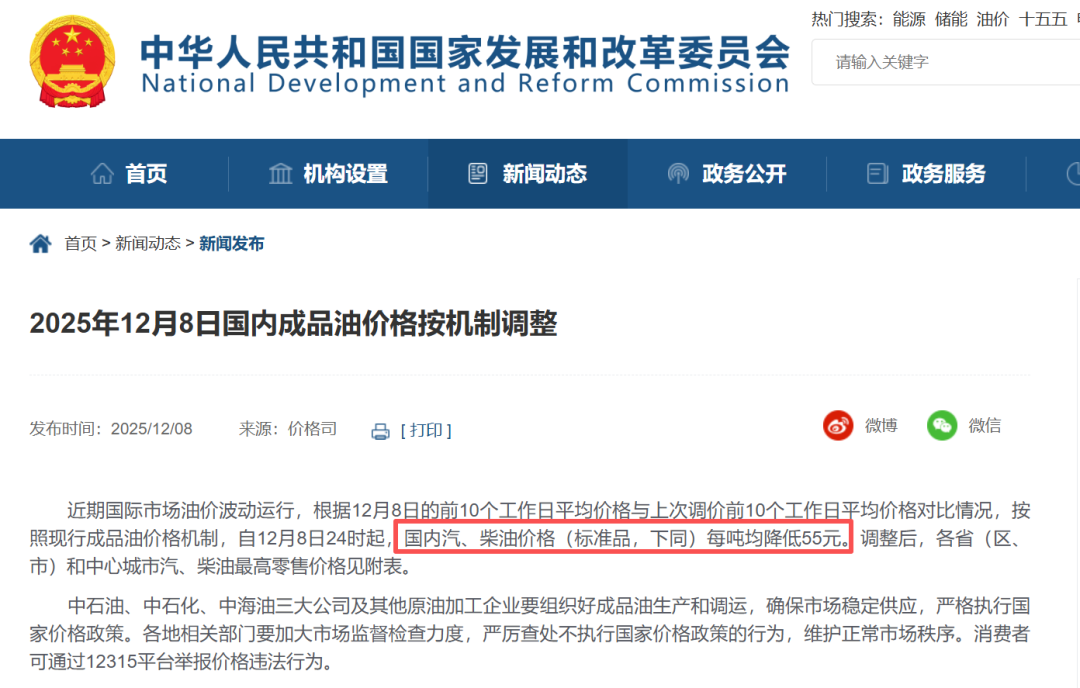 油价调整详情 - 国家发展改革委宣布自12月8日24时起国内汽、柴油价格每吨均降低55元 [1] - 折合升价后92汽油、95汽油、0柴油分别下降0.04元、0.05元、0.05元 [3] - 加满一箱50L的92汽油将少花2元 [3] 对消费者及物流行业的影响 - 以月跑两千公里、百公里油耗8升的小型私家车为例在下次调价窗口开启前用油成本将下降3元 [3] - 物流行业以月跑10000公里、百公里油耗38L的重型卡车为例单辆车的燃油成本将减少89元左右 [3] 年内油价调整回顾与趋势 - 此次调整为年内第11轮下调今年以来国内成品油价格经历24轮调整分别为“7涨11跌6搁浅” [3] - 合并计算后国内汽、柴油与年初价格相比分别下跌745元/吨、715元/吨 [3] 近期原油市场动态与驱动因素 - 本计价周期内欧洲局势扰动美国石油累库叠加感恩节假期市场交投清淡原油价格整体呈现窄幅波动态势 [3] - 原油变化率持续在负值范围内运行 [3] - 当前市场受到“乌克兰和平谈判缺乏进展”的利好与“OPEC+产量保持韧性”的利空两种相反力量拉扯 [6] 机构分析与未来展望 - 惠誉分析师表示与冲突相关的风险溢价正在抵消2025年第四季度以来不断累积的供应过剩的影响预计供应过剩将延续到新的一年 [6] - 卓创资讯认为市场关注美联储降息节奏美元趋势性走弱可能为原油价格带来长期提振短期油价维持偏强运行行情 [6] - 按照上周五原油收盘价格测算新周期的原油变化率正值开局 [6]
