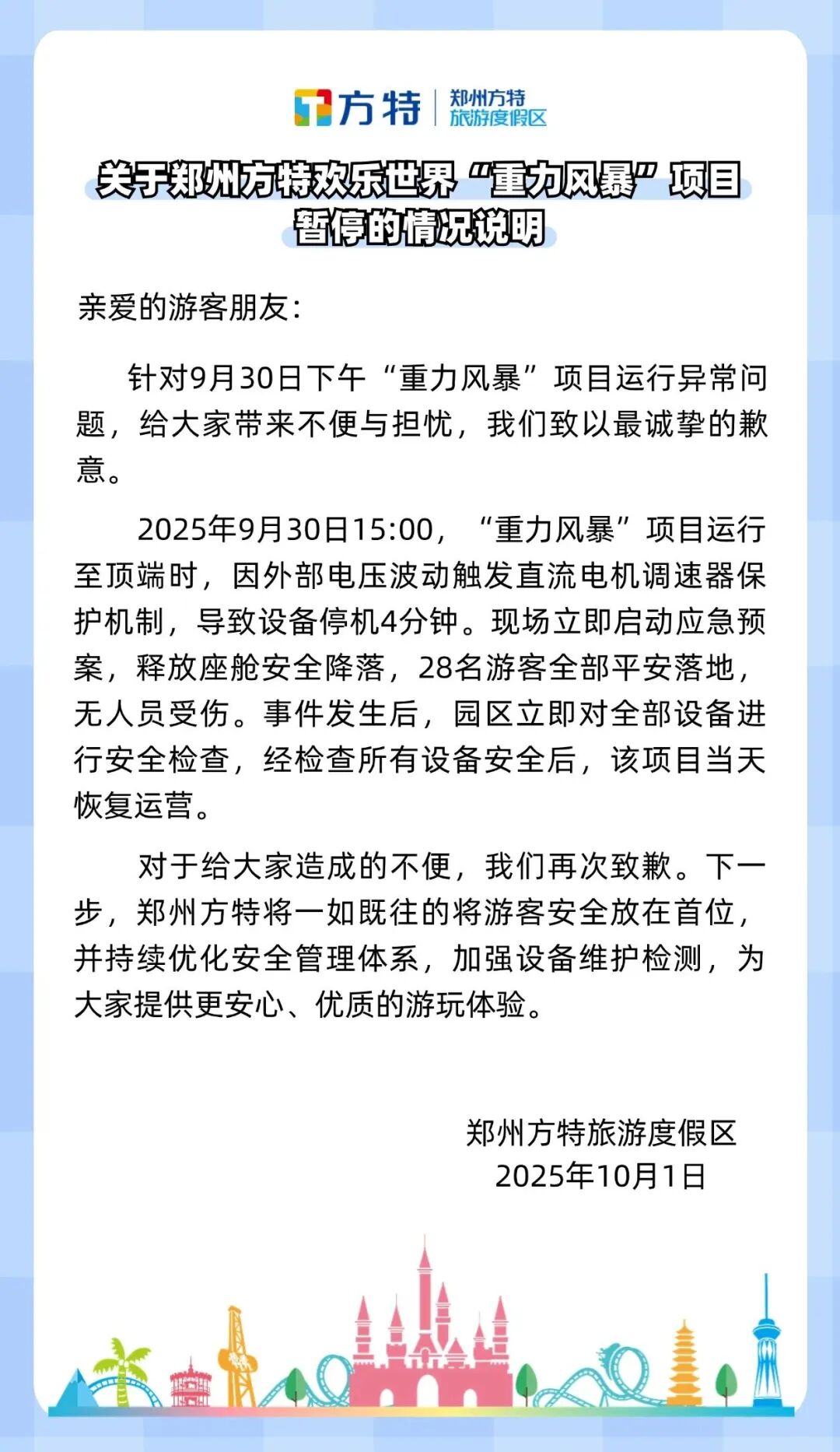 来源:@郑州方特旅游度假区、极目新闻 据极目新闻报道,9月30日,有网友发布视频称,郑州方特欢乐世界跳楼机载人后在高空悬停时长七八分钟,后才开始正常运行。 10月1日,郑州方特旅游度假区致歉并发布情况说明。 说明称,9月30日15:00,"重力风暴"项目运行至顶端时,因外部电压波动触发直流电机调速器保护机制,导致设备停机4分钟。现场立即启动应急预案, 释放座舱安全降落,28名游客全部平安落地,无人员受伤。事件发生后,园区立即对全部设备进行安全检查,经检查所有设备安全后,该项目当天恢复运 营。 郑州方特称,将一如既往将游客安全放在首位,并持续优化安全管理体系,加强设备维护检测。 (文章来源:中国基金报) ...