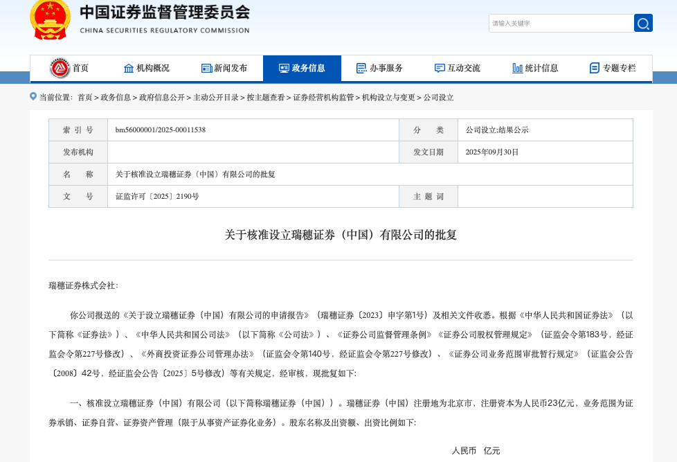 【导读】瑞穗证券(中国)获批设立,外资独资券商再增1家 9月30日,中国证监会正式发布批复,核准设立瑞穗证券(中国)有限公司(以下简称瑞穗证券(中国))。这是国内第6家外资独资证券 公司,也是首家日资独资券商。 | 中国证券监督管理委员会 | 请输入关键字 | O | CHINA SECURITIES REGULATORY COMMISSION | | | | | | --- | --- | --- | --- | --- | --- | --- | --- | | 目 专题专栏 | 公 首页 | ■ 新闻发布 | 国政务信息 | 三. 办事服务 | 000 统计信息 | 命 机构概况 | 曰 互动交流 | | ♀ 当前位置:首页 > 政务信息 > 政府信息公开 > 主动公开目录 > 按主题查看 > 证券经营机构监管 > 机构设立与变更 > 公司设立 | | | | | | | | | bm56000001/2025-00011538 | 公司设立;结果公示 | 蒙 引 号 | से | 类 | | | | | 2025年09月30日 | 发布机构 | 发文日期 | | | | | | | 名 | 称 | 关 ...