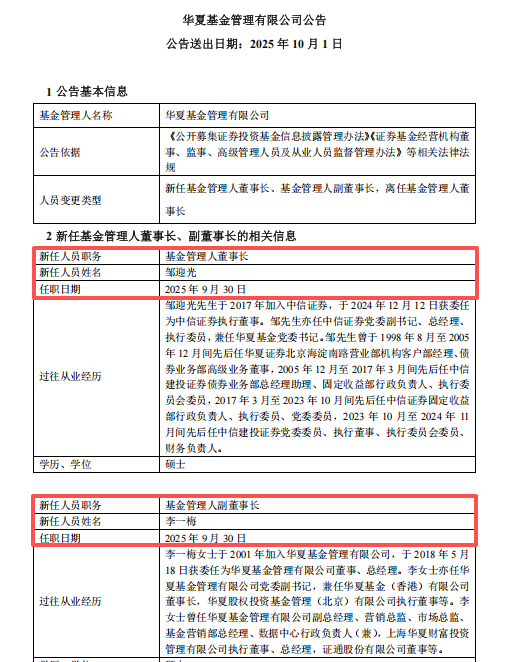 【导读】3万亿元公募巨头官宣:邹迎光新晋董事长,李一梅任副董事长 资产管理规模超3万亿元的华夏基金,官宣换帅! 9月30日晚间,华夏基金发布公告称,邹迎光新晋华夏基金董事长,李一梅新晋公司副董事长,任职日期为9 月30日。原华夏基金董事长张佑君因工作需要离任。 | 新任人员职务 | 基金管理人董事长 | | --- | --- | | 新任人员姓名 | 邹迎光 | | 任职日期 | 2025年9月 30日 | | 过往从业经历 | 邹迎光先生于2017年加入中信证券,于2024年12月12日获委任 | | | 为中信证券执行董事。邹先生亦任中信证券党委副书记、总经理、 | | | 执行委员,兼任华夏基金党委书记。邹先生曾于1998年8月至2005 | | | 年12月间先后任华夏证券北京海淀南路营业部机构客户部经理、债 | | | 券业务部高级业务董事,2005年12月至2017年3月间先后任中信 | | | 建投证券债券业务部总经理助理、固定收益部行政负责人、执行委 | | | 员会委员,2017年3月至2023年10月间先后任中信证券固定收益 | | | 部行政负责人、执行委员、党委委员,2023年10月 ...