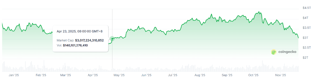 全球最大加密货币比特币正经历2022年行业崩溃以来最糟糕的单月表现。 周五,比特币价格一度跌至80,553美元,尽管纽约时段尾盘反弹,但较10月初创下的12.6万美元历史高位依旧下跌超过30%。这轮暴跌使比特币11 月跌幅达到约25%,为2022年以来的最差表现。 当年6月,比特币单月跌幅达41%,TerraUSD稳定币项目崩溃引发了一系列企业倒闭,最终导致FTX交易所垮台。 周五第二大加密货币以太坊同样遭受重创,跌幅一度达到8.9%,跌破2,700美元。根据CoinGecko数据,整个加密货币市场总市值自4月以来首次 跌破3万亿美元。 (加密货币市场总市值自4月以来首次跌破3万亿美元) 分析认为,强制清算与ETF结构性抛售的叠加令市场陷入脆弱状态,而机构投资者似乎并未趁低买入。 清算潮与抛售压力加剧市场动荡 比特币的暴跌始于10月10日的一轮大规模清算事件。当日190亿美元的杠杆头寸被强制平仓,令整个加密货币市场蒸发约1.5万亿美元市值。此后 市场一直未能恢复元气。 过去24小时内,又有20亿美元的杠杆头寸遭到清算,据CoinGlass数据显示。永续期货的未平仓合约较10月峰值940亿美元下降了35%,表明 ...
