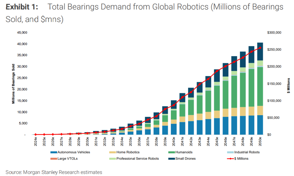 核心观点 - 摩根士丹利认为,轴承是机器人产业链中不可或缺、难以替代且具备长期成长性的核心基础零部件,其市场规模将从2025年的8.27亿美元增长约300倍至2050年的2550亿美元 [1][4][7] 行业定位与属性 - 轴承被定位为机器人“身体”板块的核心使能技术,与电机、传感器等并列,是支撑机器人物理能力的基础 [4] - 尽管轴承本质上是工业大宗商品,但在机器人经济背景下,其供应安全、产能冗余和本土化制造等战略性需求将为优质制造商带来超越传统周期的溢价空间 [4] - 轴承的功能是减少摩擦、支撑旋转部件,是任何存在运动的机器中不可或缺的“润滑剂” [5] 市场需求驱动因素 - 机器人领域的轴承需求与机器人的自由度直接相关,机器人越复杂,所需轴承数量越多,精密轴承占比越高 [6] - 需求增长来源于机器人形态的多样化,包括工业机器人、人形机器人、自动驾驶汽车、家用机器人、专业服务机器人、无人机及垂直起降飞行器等 [7] - 具体来看,一架小型四旋翼无人机可能搭载8至12个轴承,而一台人形机器人则可能需要70个或更多轴承 [9] 作为投资标的的七大优势 - **形态无关性**:所有机器人形态都需要轴承 [9] - **低替代风险**:其物理功能无法通过设计被其他零部件替代 [9] - **低内部化风险**:整机厂商自行生产轴承的可能性有限 [9] - **低过时风险**:作为基础机械元件,不存在被颠覆性技术淘汰的风险 [9] - **内容随复杂度扩展**:机器人复杂度提升直接带动轴承用量和价值增长 [9] - **精密化推动ASP上行**:向高精度轴承的结构性迁移将持续提升平均售价 [9] - **周期性叠加成长逻辑**:机器人浪潮为传统周期性轴承行业提供了长期价值重估的催化剂 [9] 市场规模预测 - 摩根士丹利预测,全球机器人领域的轴承市场规模将从2025年的约8.27亿美元增长至2050年的约2550亿美元,增幅约300倍 [1][7] - 该预测数字仅涵盖原始设备需求,尚未纳入替换件与售后市场,因此实际市场空间可能更为可观 [1][7] - 精密轴承已被OpenAI在其硬件制造产能需求建议书中列为机器人六大关键零部件之一,印证了其重要性 [4]