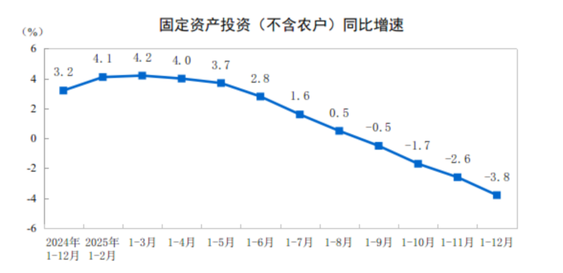 中国2025年固定资产投资同比下降3.8%,采矿业投资增长2.5%、制造业增长0.6%
