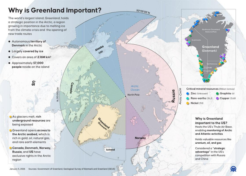 核心观点 - 摩根大通对当前美欧因格陵兰岛问题引发的市场波动持谨慎乐观态度 认为当前的混乱局面最终将降级为一种“谈判达成的安排”而非全面危机[1] - 该行认为美国表现出的强硬姿态是旨在触发谈判的博弈策略 预计解决方案可能在达沃斯世界经济论坛期间浮出水面[1] - 尽管市场波动加剧且部分风险指标亮起“橙色警报” 但该行对市场前景并不悲观 认为因此出现中等个位数市场下跌的可能性较低[1] 对局势的预判与情景分析 - 最可能的结果是达成一项“谈判安排” 该安排将扩大美国在格陵兰岛的安全和经济存在 同时丹麦保留主权[3] - 该安排旨在满足美国加强北极安全态势、增强防御预警能力以及获得格陵兰岛自然资源使用权的目标[3] - “出售”格陵兰岛的可能性较低 因美国无需正式领土控制权即可实现战略目标 且该方案需获得丹麦和格陵兰岛双重批准难度较大[3] - “入侵”被视为极小概率的尾部风险 因其在选民中极不受欢迎且可能导致北约迅速解体[3] 关键催化剂与市场观察 - 达沃斯世界经济论坛是重要催化剂 特朗普定于1月21日发表的演说可能聚焦于美联储主席潜在人选及负担能力议题[3] - 美国最高法院将听取关于美联储理事Lisa Cook的口头辩论[3] - 宏观层面 摩根大通观察到今年开局强劲 行业和区域处于领先地位 投资者预期2026年经济将重启[3] - 摩根大通的交易台自9月以来一直在进行做多英国利率/做空美国利率的价差交易[3]