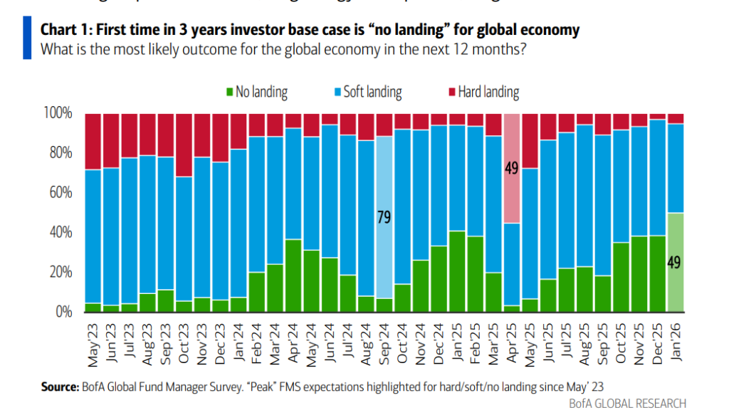 全球投资者正陷入"极致贪婪"的状态,市场情绪已被推升至2021年年中以来的最高水平。根据美银最新发布的全球基金经理调查,随着基金经理 们大举追逐风险资产,投资组合中的现金水平已暴跌至历史最低点,市场普遍押注全球经济将出现"不着陆"的情景。 据彭博及美银报告显示,本次调查于2026年1月8日至15日进行,共有227位基金经理参与,管理资产总额达6460亿美元。调查结果描绘了一个流动 性充裕、信心爆棚,但也因防御缓冲消失而对潜在冲击日益敏感的市场图景。 "不着陆"共识确立,衰退担忧消退 宏观层面的乐观情绪是本次调查的核心驱动力。调查显示,净38%的投资者预计未来12个月全球经济将走强,这一比例创下2021年7月以来的新 高。更为关键的是,49%的投资者现在认为"不着陆"(经济增长保持强劲且通胀未完全回落)是最可能的结果,这一比例首次超过了"软着 陆"和"硬着陆"。 与此同时,对经济衰退的担忧已降至冰点。仅有9%的受访者认为未来12个月可能出现全球衰退,为2022年1月以来的最低水平。相反,预期经济 将出现"繁荣"(即高于趋势的增长和高于趋势的通胀)的投资者比例升至34%,创下2021年9月以来的最高纪录。投资者对 ...