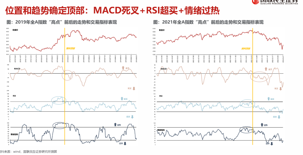 核心观点 - 国联民生证券分析认为,当前A股市场虽情绪偏热,但距离牛市顶部尚有空间,仓促离场可能并非最优策略 [1] 估值维度分析 - 资产证券化率(总市值/GDP)为82%,低于2007年(110%)和2015年(107%)牛市顶点时的水平,显示资产价格相对于实体经济规模仍有上涨空间 [5] - 股权风险溢价(ERP)已超过1倍标准差,但尚未触及2倍标准差的极端水平,表明市场风险尚未达到历史高位 [8] - 根据模型测算,若ERP处于+2倍标准差水平,对应上证指数点位约在2991点至3187点区间(假设10年期国债收益率在1.5%至2.0%之间)[9] - 当前市场主线行业估值相对合理,尚未出现类似2015年计算机、2021年电力设备等行业曾出现的超涨40%以上的泡沫化极端溢价 [10] 交易与技术维度分析 - 截至1月14日,RSI指标为73,情绪指标(股价高于30日均线的个股比例)为81,两者均进入高位区间,表明市场处于超买和过热状态 [14] - 确认市场顶部的关键信号是MACD指标由“金叉”转为“死叉”并出现顶背离,而当前MACD仍维持金叉状态,显示上涨动能依然存在,上升趋势尚未逆转 [1][14] - 融资余额指标具有参考价值,当融资余额占流通市值比例接近2.5%,或融资买入额占成交额比例上升至11%左右时,大概率对应市场阶段性高点 [18]