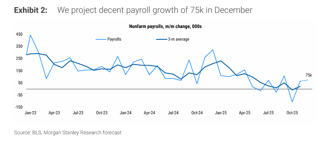 文章核心观点 - 市场高度关注美国12月非农就业报告,以寻找美联储未来政策路径的线索,特别是1月会议是否会暂停降息 [1] - 报告结果将修正市场对美国经济韧性的认知,并直接决定投资者对2026年开年货币政策环境的预期 [4] 非农就业数据市场预期 - 市场共识预期12月非农就业新增人数为7万至7.5万人,较11月的6.4万人小幅回升 [1][5] - 预测区间从低端的2.3万人到高端的15.5万人不等,且没有任何机构预测会出现负增长 [5] - 高盛预测新增就业人数为7万人,与市场共识一致 [5] - 摩根士丹利给出了略显乐观的7.5万人预测 [5] 影响就业数据的潜在因素 - 正面因素:假日零售招聘向12月转移可能带来约1.5万人的提振 [5] - 负面因素:联邦政府持续招聘冻结预计将导致政府部门就业人数减少5000人;调查初期的寒冷天气和降雪可能对建筑及休闲酒店业造成约2万人的拖累 [5] - 早前发布的ADP就业报告显示,12月私营部门新增就业4.1万人,略低于预期,但小企业在经历了11月的失业后已恢复招聘 [5] 失业率预期与市场影响 - 市场普遍预计12月失业率将从4.6%回落至4.5% [4][7] - 摩根士丹利和高盛预测,失业率有回落至4.5%的可能性,若成真将增加美联储在1月维持利率不变的概率 [4] - 花旗预测12月美国失业率可能升至4.7%,这可能促使美联储在本月降息25个基点 [7] - 更广泛的劳动力市场闲置正在显现,新毕业生求职困难以及接受自愿买断的前联邦雇员推高了失业率,但这些人往往没有资格领取失业救济金,导致持续申领失业金人数指标可能被低估 [7] 消费者信心与劳动力市场体感 - 世界大型企业联合会12月调查显示,认为“工作机会充足”的受访者比例从28.2%降至26.7%,而认为“工作难找”的比例则有所上升,表明普通民众对就业市场的“体感”正在变冷 [8] 美联储政策前景博弈 - 美联储在去年12月将利率下调25个基点至3.50-3.75%区间 [9] - 对于1月政策会议,本次非农报告将起到决定性作用 [9] - 目前货币市场定价显示,美联储在1月维持利率不变的概率约为80%,而到3月进一步降息25个基点的概率约为48% [4] - 巴克莱分析认为,会议纪要暗示美联储可能在1月暂停降息 [9] - 摩根士丹利认为,如果失业率保持在4.6%,美联储在1月继续降息的理由依然充分 [9] 市场潜在反应与策略观点 - 期权市场定价显示,标普500指数在数据发布当日的潜在波动幅度约为1.2% [10] - 摩根大通情景分析指出,最有利于股市的结果是新增就业人数落在0至10.5万人之间,被视为“金发姑娘”区间 [10] - 具体市场反应推演:新增7.5万-10万人,标普500指数可能上涨0.25%-1%;新增3.5万-7.5万人,可能上涨0.25%-0.75%;高于10.5万人,股市可能下跌0.5%-1%;低于0,股市可能下跌0.5%-1.25% [12] - 高盛交易部门认为,只要劳动力市场保持稳定,配合高于共识的经济增长和美联储的宽松倾向,将构成对美股有利的宏观组合 [10] - 高盛也提醒,鉴于目前股票估值较高,市场对极其疲软的劳动力数据依然脆弱,防御性板块如医疗保健和必需消费品可能成为资金避险的去处 [10] - 外汇方面,高盛策略师指出,若数据符合预期且失业率回落至4.5%,可能利好澳元等高贝塔货币,而日元可能因收益率上升而表现不佳 [10]
