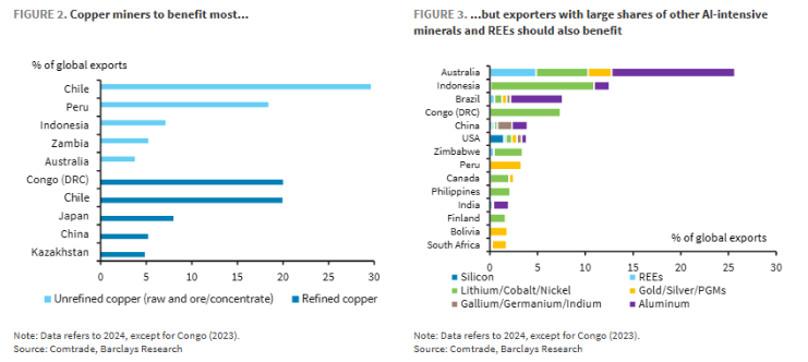 巴克莱认为AI投资狂潮正在催生一场全球大宗商品的超级周期,对投资者而言意味着重大机遇。 追风交易台消息,11月19日,巴克莱研究部发表研报,随着AI基础设施建设的持续升级,对特定矿产和稀土元素的需求将急剧攀升,这将为矿产出口国 带来多年投资周期的红利。 研报强调在所有受AI驱动的大宗商品中,铜的需求最为突出。智利、秘鲁、刚果(金)和澳大利亚等矿业出口国将迎来多年的投资繁荣,对应主权货币 汇率有望走强。 国也将从AI投资潮中受益) (左图:铜矿商将受益最多,右图:矿业出口 巴克莱指出,目前铜价上涨与油价疲软并存的罕见现象,对于那些进口石油但出口金属的国家(如智利、秘鲁)来说是巨大的贸易条件重大利好,为其货 币提供了额外支撑。 AI投资推动商品需求爆发式增长 AI基础设施建设的速度决定了技术进步的步伐,而这一建设过程严重依赖特定矿产和稀土元素,使大宗商品日益成为焦点。 研报估计,仅超大规模云服务商在未来五年的资本支出就将超过2.5万亿美元。分析认为这一数字甚至可能被低估,因为估算数据通常是滞后指标,且不 包括非超大规模企业和私营公司。 能源、电力、电气基础设施、冷却和散热管理、半导体和硬件投入,以及数据中心建筑材 ...