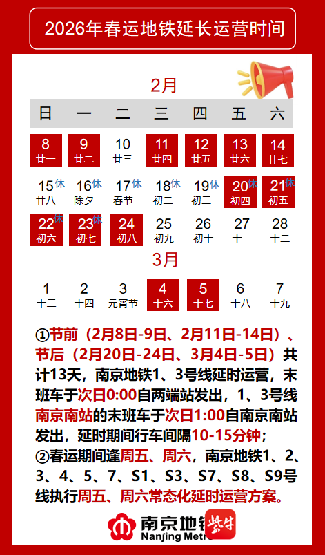 地铁运营调整 - 南京地铁在2026年春节期间及春运特定日期实施延时运营安排,共计13天,具体日期为2月8日至9日、2月11日至14日、2月20日至24日以及3月4日至5日 [1] - 延时运营期间,地铁1号线和3号线末班车于次日0:00从两端站发出,而1号线和3号线在南京南站的末班车则进一步延时至次日1:00发出 [1] - 延时运营期间,地铁1号线和3号线的行车间隔约为10至15分钟 [1] - 整个春运期间,每逢周五和周六,地铁1、2、3、4、5、7号线以及S1、S3、S7、S8、S9号线将执行常态化延时运营方案 [1] 客流管理与服务 - 为保障春运运输安全平稳,在客流量过大时,夫子庙、武定门等车站将视情况采取临时限流或跳站等管控措施 [4] - 公司建议乘客合理规划出行时间,并听从车站工作人员的指引 [4] - 乘客如有疑问,可咨询车站工作人员或拨打南京地铁服务热线025-51899999 [4]