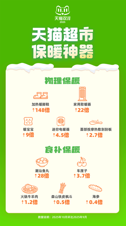 另外,石墨烯发热马甲、USB充电围脖等"隐形保暖"等新品也迅速走红,显示出年轻人"既要温度也要 风度"的新需求。 据悉,天猫双11前,天猫超市闪购店已经覆盖城市全国31个城市,通过优化前置仓布局、实施一日三 配,已在多个城市实现"最快4小时送达"。 在"即时保暖"的消费需求下,暖宝宝的销量最好,其中上海消费者的需求量位居全国首位。此外,消费 者对仙炖燕窝、蛋白粉、阿胶糕等产品即时需求也更高,在一众食补保暖商品中,这三种的增长更加明 显。阿胶糕则呈现出"南北通吃"的特点,在上海、武汉、北京、沈阳等多地均受欢迎。 一场全国大降温,让"买温暖"成了很多人的头等大事。 天猫超市最新数据显示,自10月全国多地大幅降温以来,保暖品类销量大幅攀升,各种保暖抗冻商品环 比9月实现百倍增长。 从家用取暖器到便携发热装备,再到火锅食材,保暖消费实现"穿暖+吃暖"双线增长。平台数据显示, 10月以来,天猫超市家用节能取暖器搜索环比增长超40倍;而牛羊卷、鱼丸等火锅食材销售额环比增长 近17倍。 今年,相比"食补",年轻人更偏爱物理保暖,各类取暖设备表现尤为亮眼。一款支持智能调温的电热鞋 在短短一个月内订单量增长超过148倍。"这对 ...