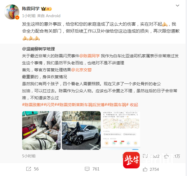 10月5日,有疑似事故另一方车主家属在社交平台上发文,称作为白车比亚迪(002594)司机家属,非 常难过发生这个事情,目前一方面在等官方答复处理结果,另一方面也看身体恢复情况。"陈震作为公 众人物,应该也不会置之不理。"这名家属称。随后,陈震对此进行了转发,并配文称,"发生这样的意 外事故,给您和您的家庭造成了这么大的伤害,实在对不起,我会全力配合有关部门,做好后续工作以 及补偿给您这边造成的损失,再次跟您道歉!" 记者注意到,有网友提出质疑,认为交警已经判定了全责,为何还要查看车辆EDR数据,意义何在?对 此,陈震也予以了回应,"我没有丝毫质疑或否认我在这次事故中的全责判定!请您不要乱带节奏!这 起事故造成了那么大的影响,还是需要完整真实还原一下事故经过的,因为现在也的确是造谣满天飞的 状态,最终官方通告和EDR数据会还原整个过程的……" 扬子晚报网10月5日讯(记者郭一鹏)10月4日,北京交警通过官方微博通报了陈震驾驶劳斯莱斯发生车祸 的调查结果,经初步调查,陈某负事故全部责任。扬子晚报/紫牛新闻对此进行了报道,当天,陈震发 文致歉,称是自己的问题,造成了这么大的负面影响,向对方道歉。10月5日,有疑似 ...